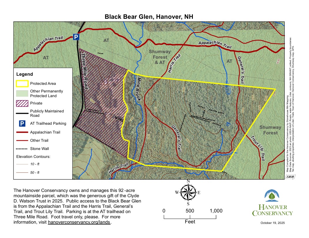 In 2024, landowners Clyde Watson and Denis Devlin contacted the Hanover Conservancy with an incredible offer: a donation of more than 90 acres of their backland on the western slope of Moose Mountain. Over the next year, the Hanover Conservancy worked with Clyde and Denis on the project which would become the Black Bear Glen. Named for some of their favorite visitors from the mountain, the black bears who have long-delighted their family, including Clyde’s father Aldren Auld Watson.